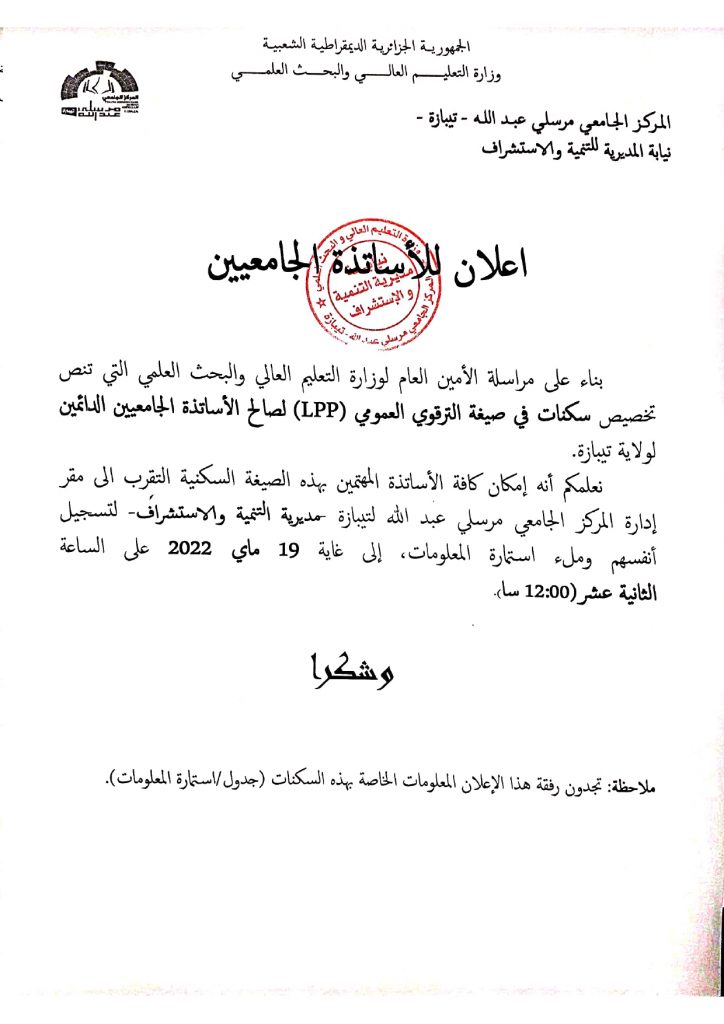 الرئيسية/إعلانات/أساتذة/إعلان عن تخصيص سكنات LPP لفائدة الأساتذة الجامعيين الدائمين بولاية تيبازة أساتذةإعلانات إعلان عن تخصيص سكنات LPP لفائدة الأساتذة الجامعيين الدائمين بولاية تيبازة 26 أبريل 2022 2٬037 أقل من دقيقة ملاحظة : يرجى ارفاق طلب خطي مع الاستمارة الوسومأساتذة المركز الجامعي تيبازة المركز الجامعي مرسلي عبد الله تيبازة تيبازة سكن 26 أبريل 2022 2٬037 أقل من دقيقة اظهر المزيد شاركها فيسبوك تويتر لينكدإن مشاركة عبر البريد طباعة