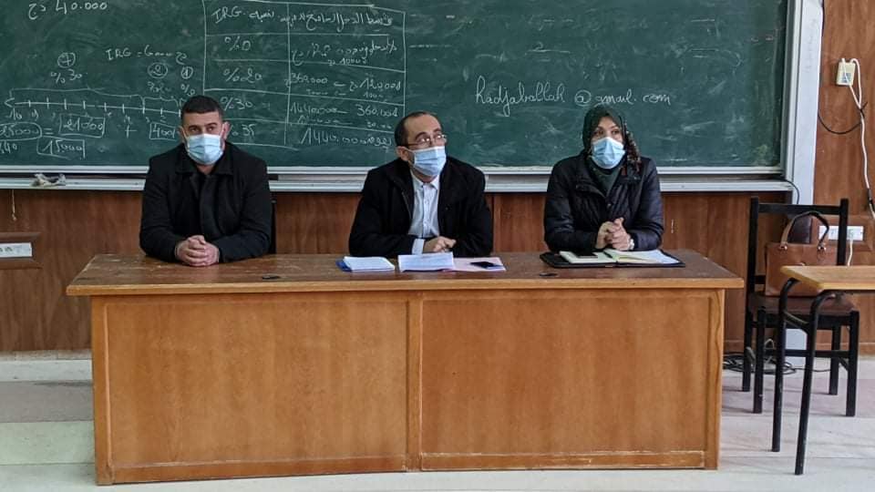 إجتماع خلية متابعة الوضع الصحي للمركز الجامعي تيبازة، برئاسة الدكتور محمد يونسي مدير المركز ،و بحضور نواب المدير وكذا مدراء المعاهد ،اضافة الى الأمين العام للمركز وبحضور ممثلي النقابات المهنية للأساتذة والموظفين، وكذا ممثلي التنظيمات الطلابية ،اضافة الى منسقة الصحة الجامعية الدكتورة كالام. وقد تطرق الحضور للوضع الصحي وكذا الإجراءات الوقائية اللازم اتخاذها قبل استئناف الدراسة بالمركز ، كما اتفق الحضور على تحديد موعد عودة الطلبة إلى مقاعد الدراسة خلال الأيام القادمة حيث سيتم اعلان ذلك في بيان رسمي الساعات القليلة القادمة.