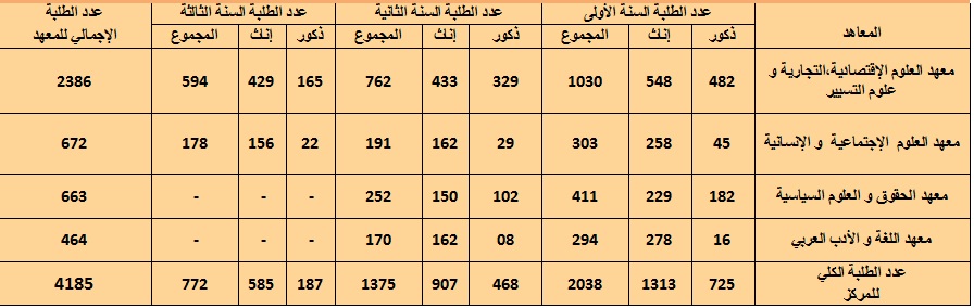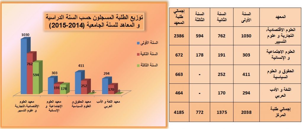 جدول إحصائيات طلبة المركز الجامعي مرسلي عبد الله حسب المعاهد للسنة الجامعية (2015-2014):