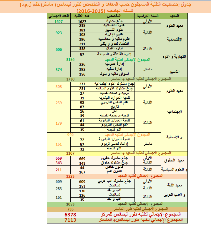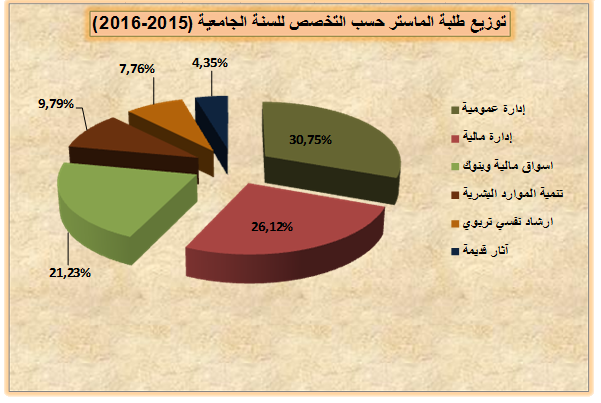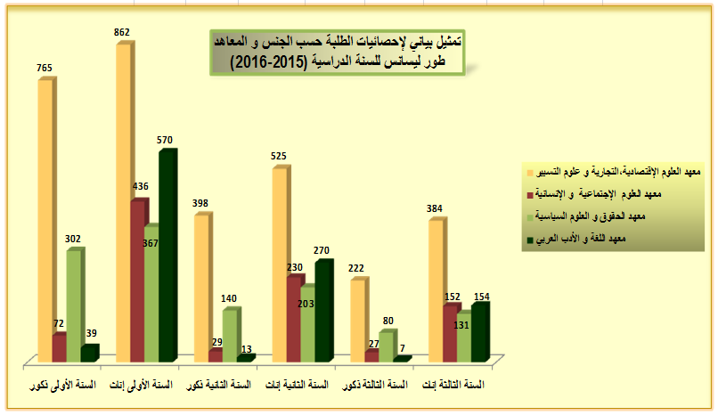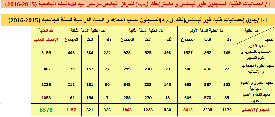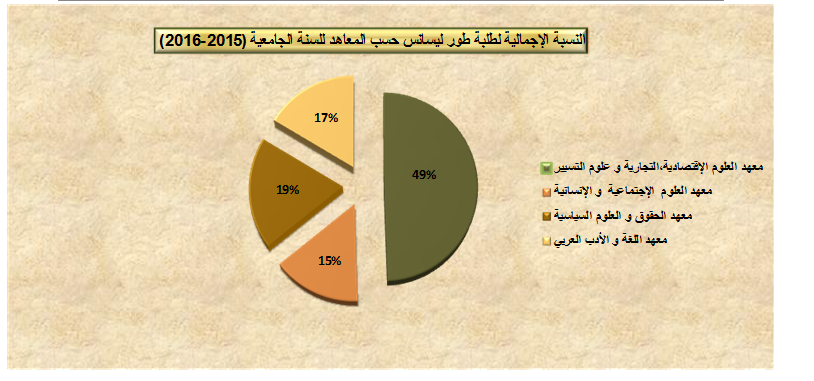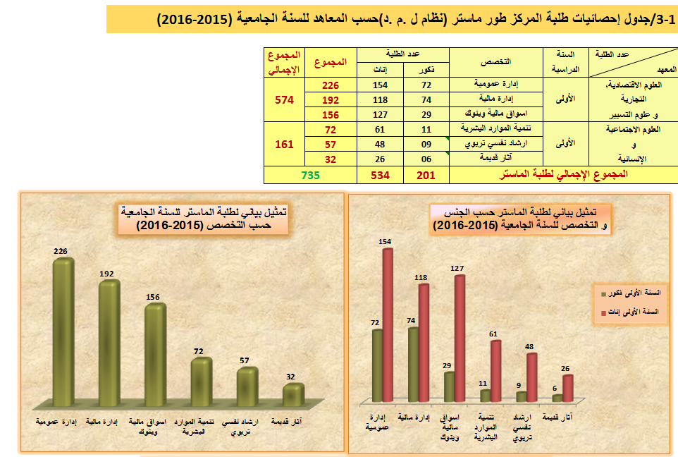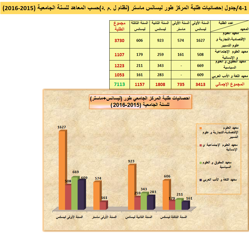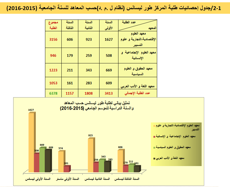 احصائيات المركز للسنة الجامعية 2015-2016 تمثيل بياني لطلبة طور الليسانس النسبة الاجمالية لطلبة الليسانس جدول احصائيات المركز طور الماستر توزيع طلبة الماستر حسب التخصص