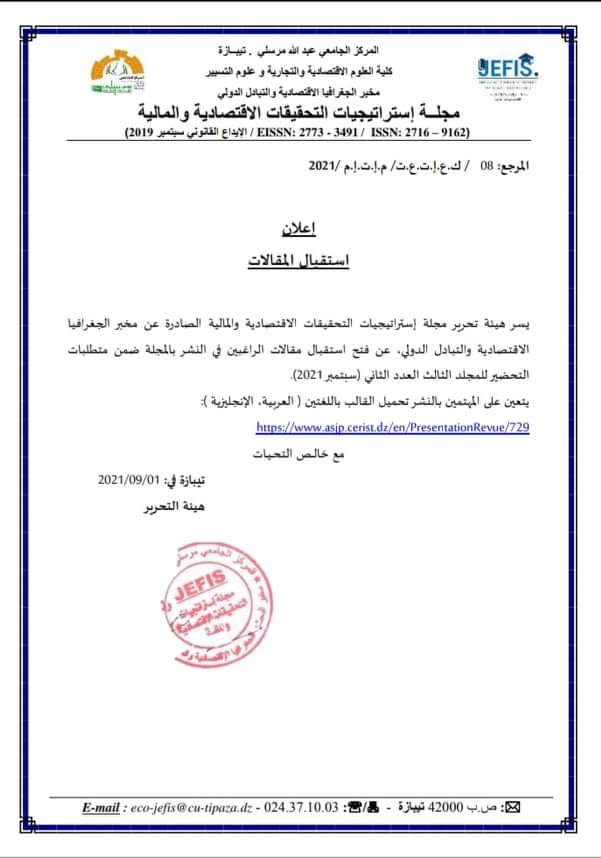 تعلن مجلة إستراتيجيات التحقيقات الاقتصادية والمالية عن استقبال المقالات تجدون التفاصيل في الاعلان التالي :