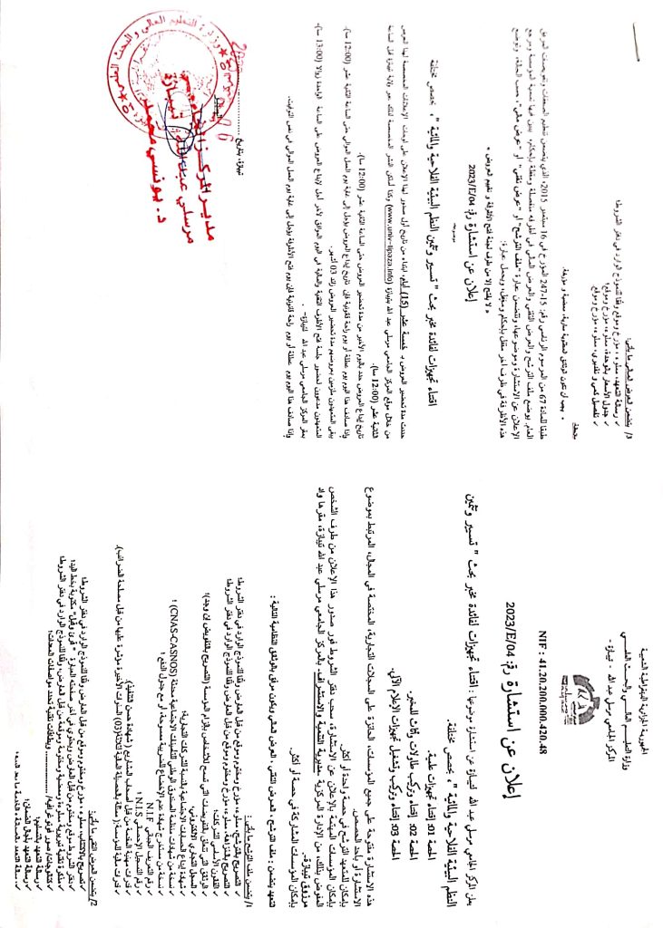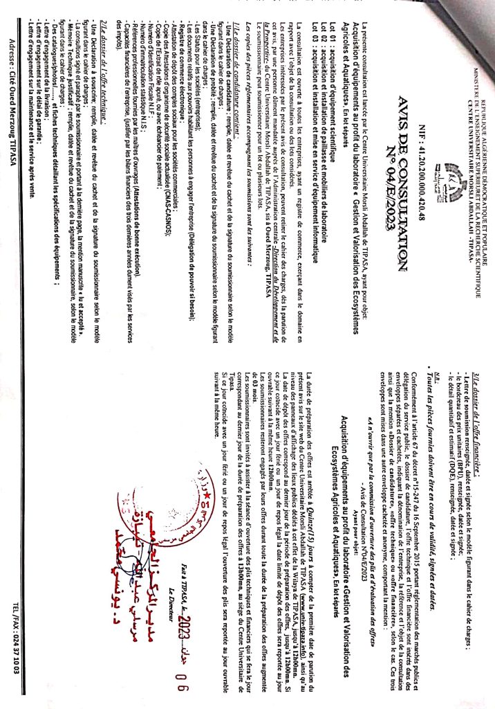 إعلان عن استشارة رقم 04/E/2023 موضوعها: اقتناء تجهيزات لفائدة مخبر بحث” تسيير وتثمين النظم البيئية الفلاحية والمائية” بحصص مختلفة: