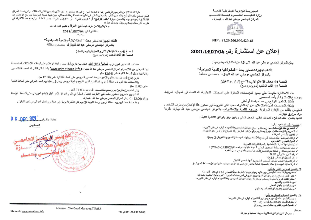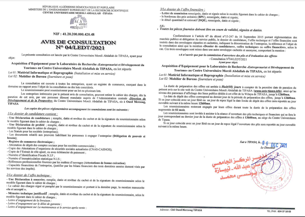 إعلان عن استشارة رقم 04/LEDT/2021 لاقتناء تجهيزات لمخبر بحث “المقاولاتيةوتنمية السياحية” بالمركز الجامعي مرسلي عبد الله تيبازة الحصة01:معدات الإعلام الآلي والنسخ (تركيب وتشغيل) الحصة 02:أثاث المكتب (تموين ووضع)