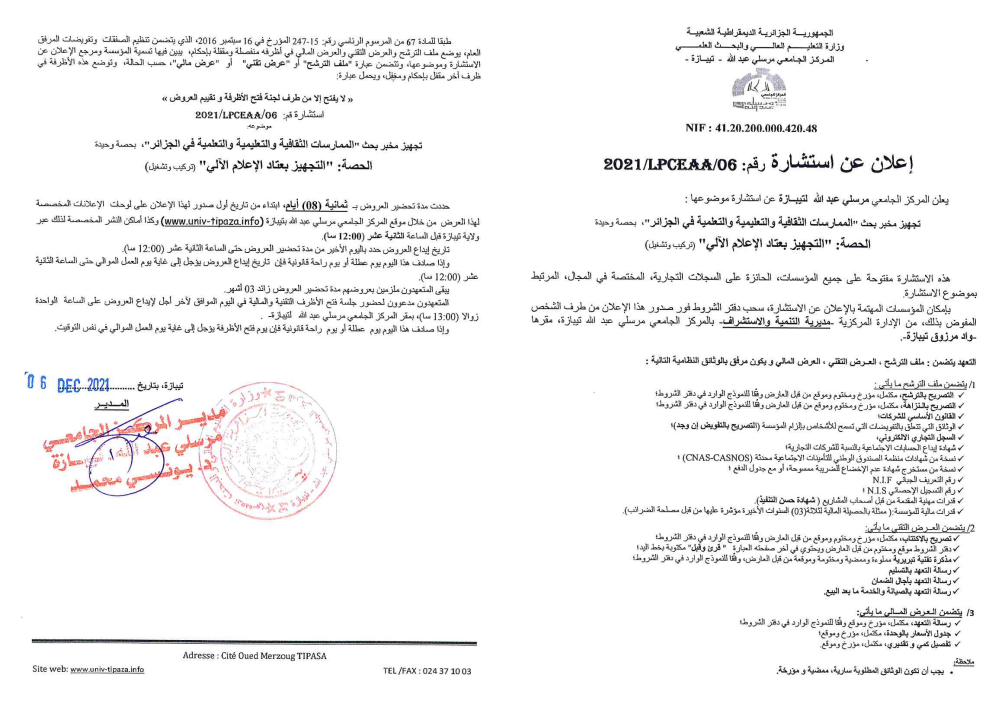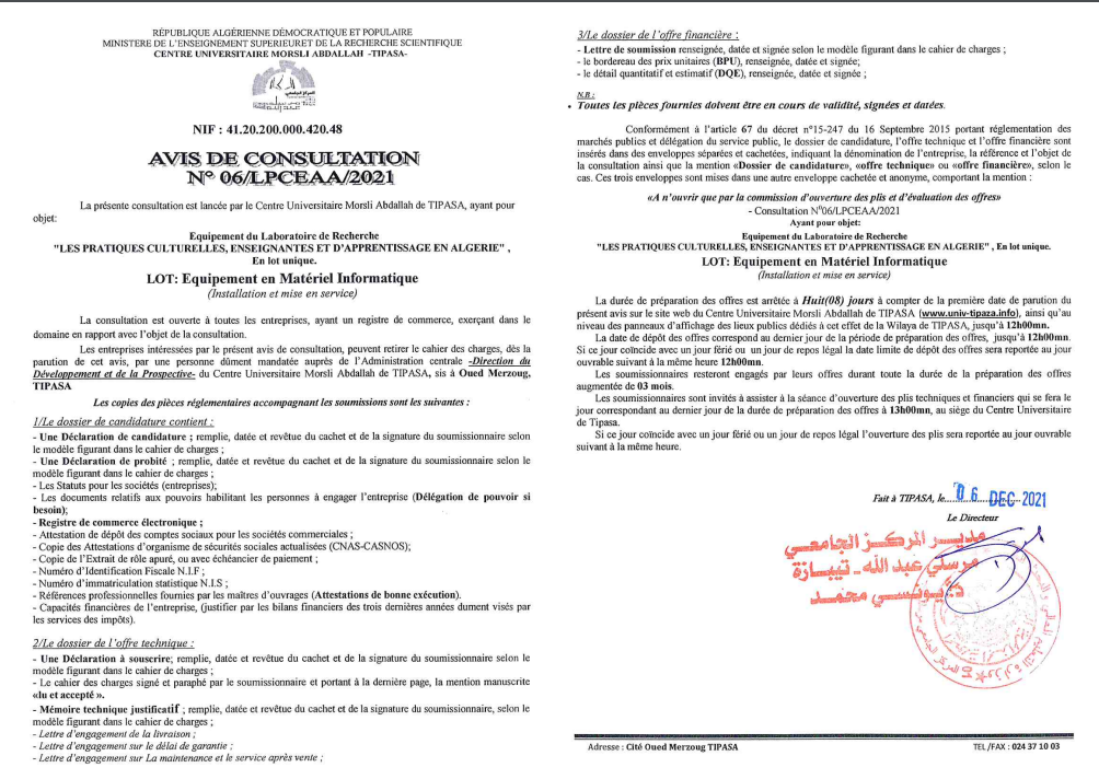 إعلان عن استشارة رقم 06/LPCEAA/2021 لاقتناء تجهيزات لمخبر بحث “الممارسات الثقافية والتعليمية والتعلمية في الجزائر” بالمركز الجامعي مرسلي عبد الله تيبازة الحصة:التجهيز بعتاد الإعلام الآلي