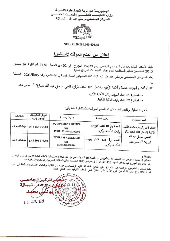 “اقتناء أثاث وتجهيزات خاصة بالمكتبة المركزية (الشطر 01) لفائدة المركز الجامعي مرسلي عبد الله -تيبازة” بحصص مختلفة: