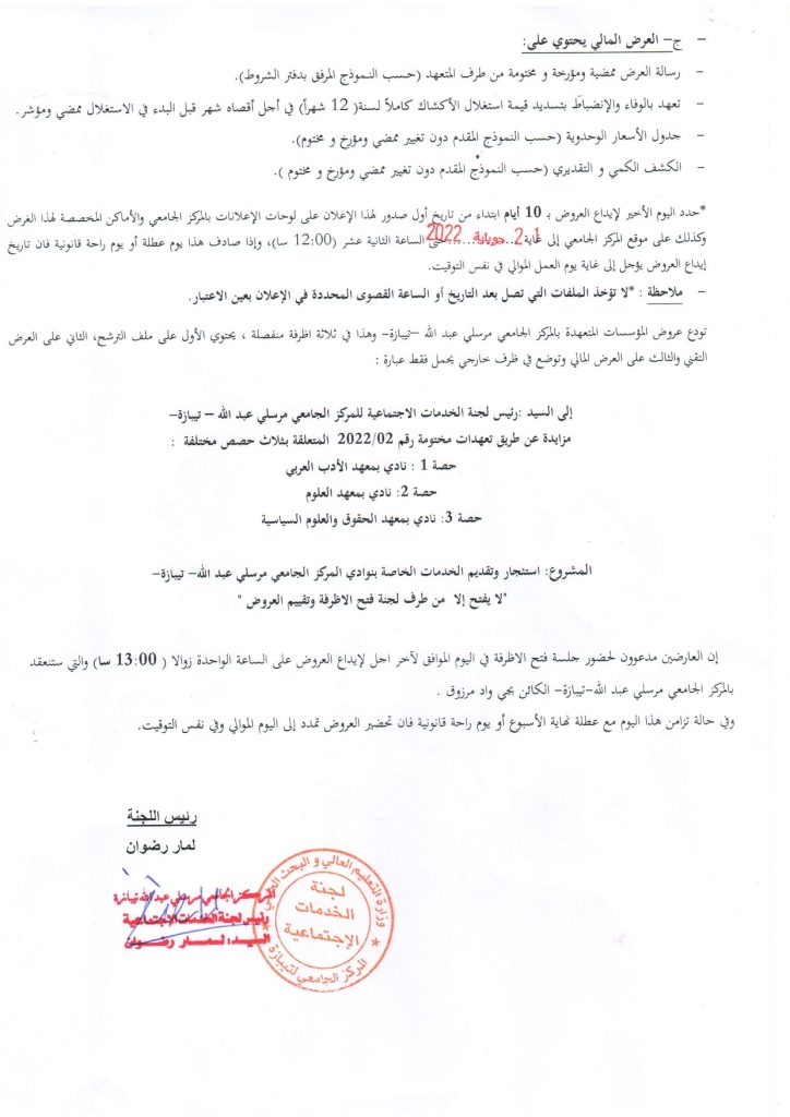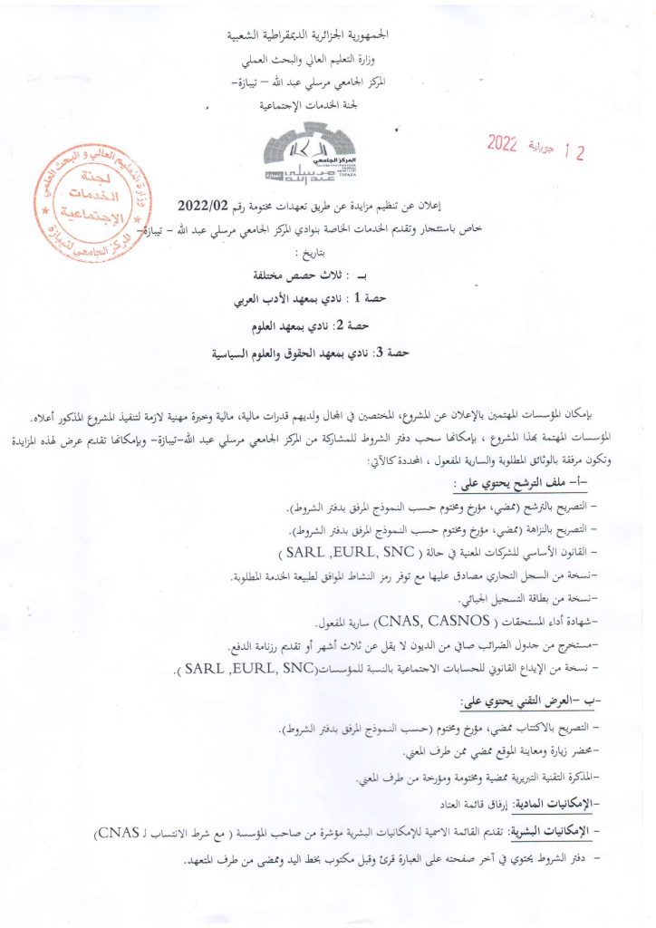 الرئيسية/إعلانات/إعلان عن تنظيم مزايدة لاستئجار وتقديم الخدمات بنوادي المركز الجامعي تيبازة إعلاناتطلبات العروض و الاستشاراتلجنة الخدمات الإجتماعية إعلان عن تنظيم مزايدة لاستئجار وتقديم الخدمات بنوادي المركز الجامعي تيبازة 12 يوليو 2022 1٬259 أقل من دقيقة 12 يوليو 2022 1٬259 أقل من دقيقة اظهر المزيد شاركها فيسبوك تويتر لينكدإن مشاركة عبر البريد طباعة