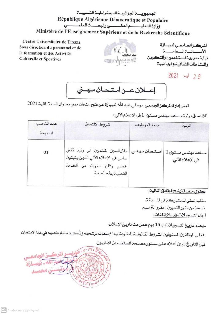 إمتحان مهني للالتحاق برتبة مساعد مهندس إعلام ألي تجدون التفاصيل في هذا الاعلام: