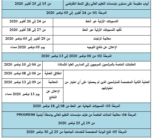 ملاحظة: حدد تاريخ 18 نوفمبر 2020 كآخر أجل للتسجيلات النهائية لحاملي شهادة البكالوريا الجدد بعنوان السنة الجامعية 2020/2021