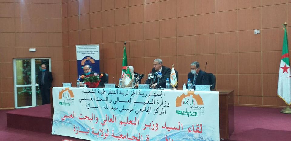 التقى وزير التعليم العالي والبحث العلمي البروفيسور عبد الباقي بن زيان بالأسرة الجامعية من أساتذة وموظفين وكذا طلبة وذلك بحضور السيدة والي تيبازة وكذا مدير المركز الجامعي مرسلي عبد الله تيبازة الدكتور محمد يونسي اضافة الى حضور السلطات المحلية والولائية وكذا المدنية والعسكرية . واستمع السيد الوزير لانشغالات الاسرة الجامعية التي طرحها ممثلو نقابات الاساتذة وكذا الموظفين اضافة الى تدخل ممثلي التنظيمات الطلابية . ووعد السيد الوزير انه سيعمل جاهدا على دراسة ومعالجة كل الانشغالات المطروحة للاسرة الجامعية بتيبازة بما فيها مرافقة ادارة المركز للرقي به الى مصاف الجامعات .