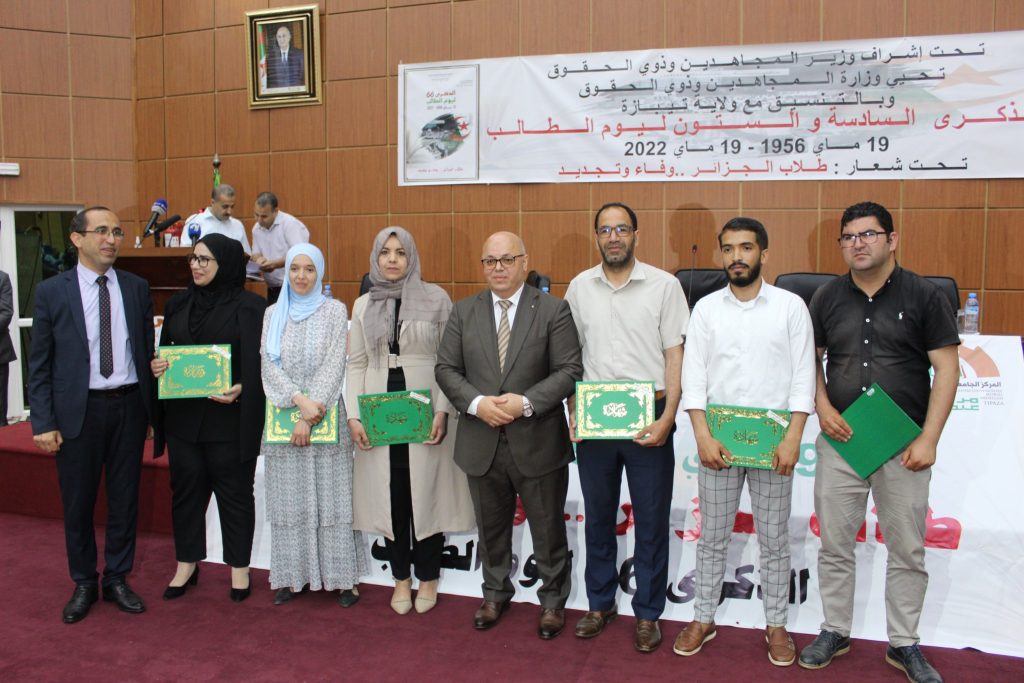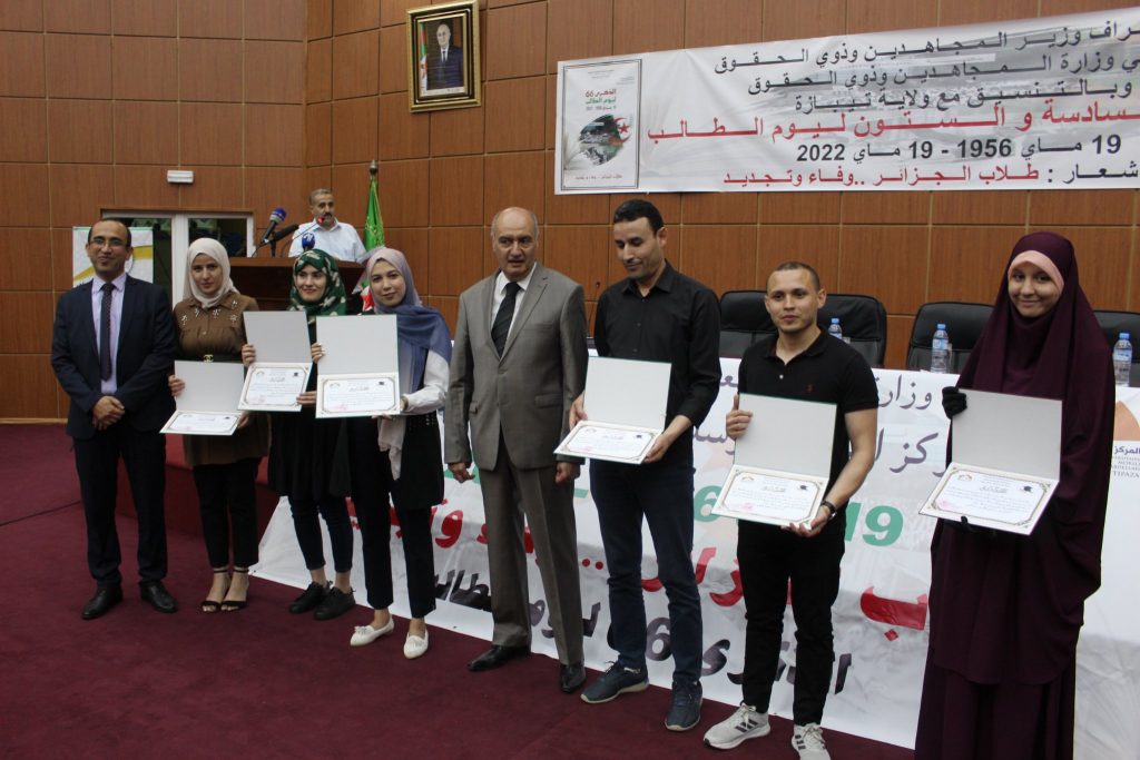 إحتضن المركز الجامعي مرسلي عبد الله تيبازة ،الاحتفالات الرسمية لعيد الطالب 19 ماي، بحضور وزير المجاهدين وذوي الحقوق السيد العيد ربيقة ،وكذا السيد والي ولاية تيبازة اضافة الى السلطات المدنية والامنية للولاية، اضافة الى الطاقم الاداري للمركز الجامعي وعلى راسهم الدكتور محمد يونسي مدير المركز ، حيث تخلل الاحتفال قراءة فاتحة الكتاب على أرواح الطلبة الشهداء ووضع اكليل من الورود على ارواحهم الطاهرة ، كما قام وزير المجاهدين والوفد الرمافق له بتدشين قاعة المحاضرات الكبرى وتسميتها باسم الشهيد عبد القادر حبوش ، ليقوم بعدها الوفد الرسمي بزيارة معرض لانجازات النوادي العلمي العلمية بالمركز ليتم في الاخير تكريم الطلبة الناجخين في مسابقة الدكتوراه بالمركز