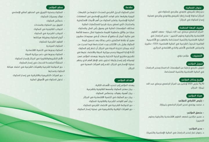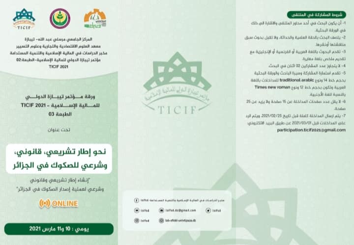 ينظم المركز الجامعي مسرلي عبد الله تيبازة ، مؤتمر تيبازة الدولي للمالية الاسلامية يومي 10-11 مارس 2021