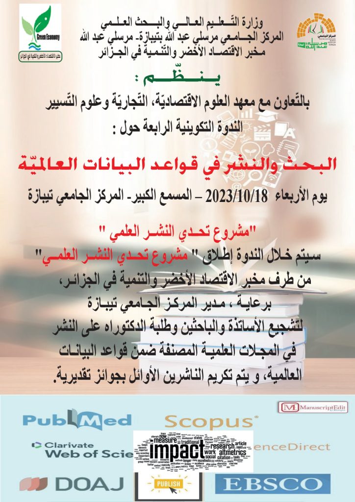 يسر السيد مدير مخبر الاقتصاد الاقتصاد الأخضر والتنمية في الجزائر ،أن يدعو جميع الأساتذة الأفاضل وطلبة الدكتوراه الأعزاء إلى حضور فعاليات الندوة العلمية الرابعة حول: