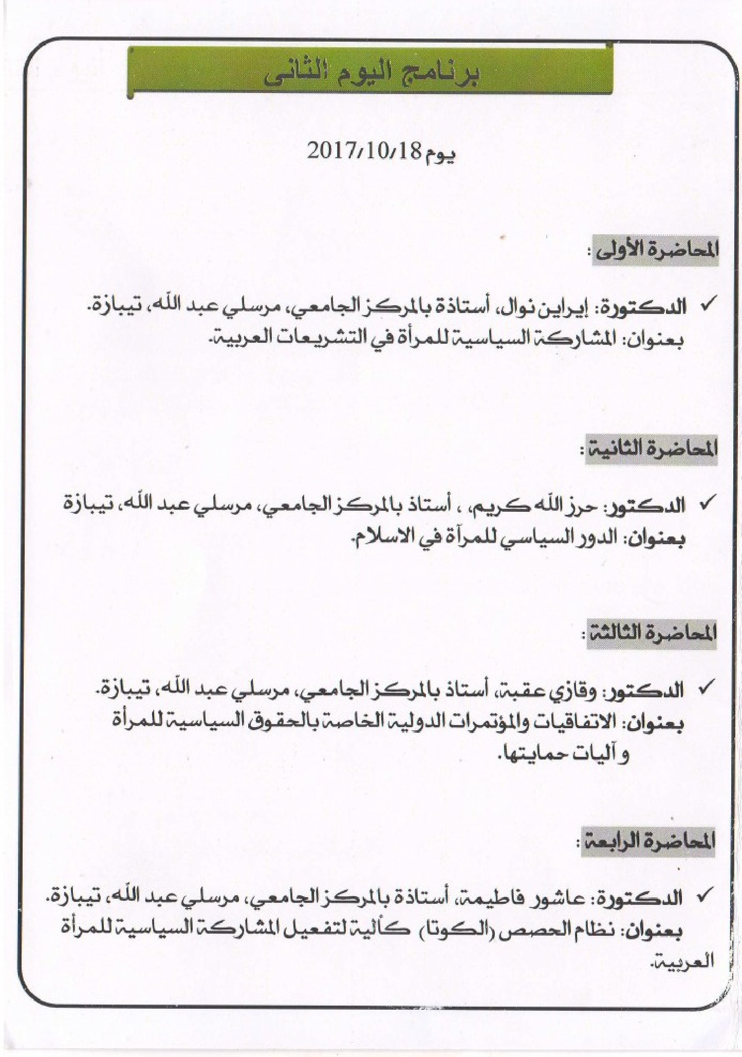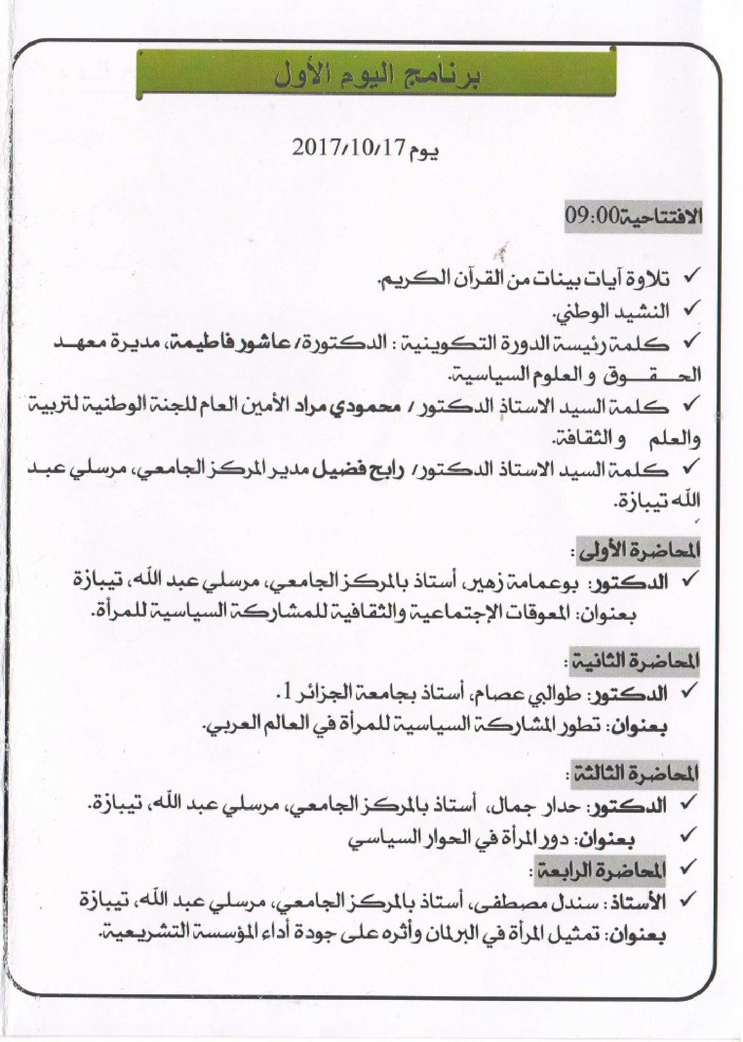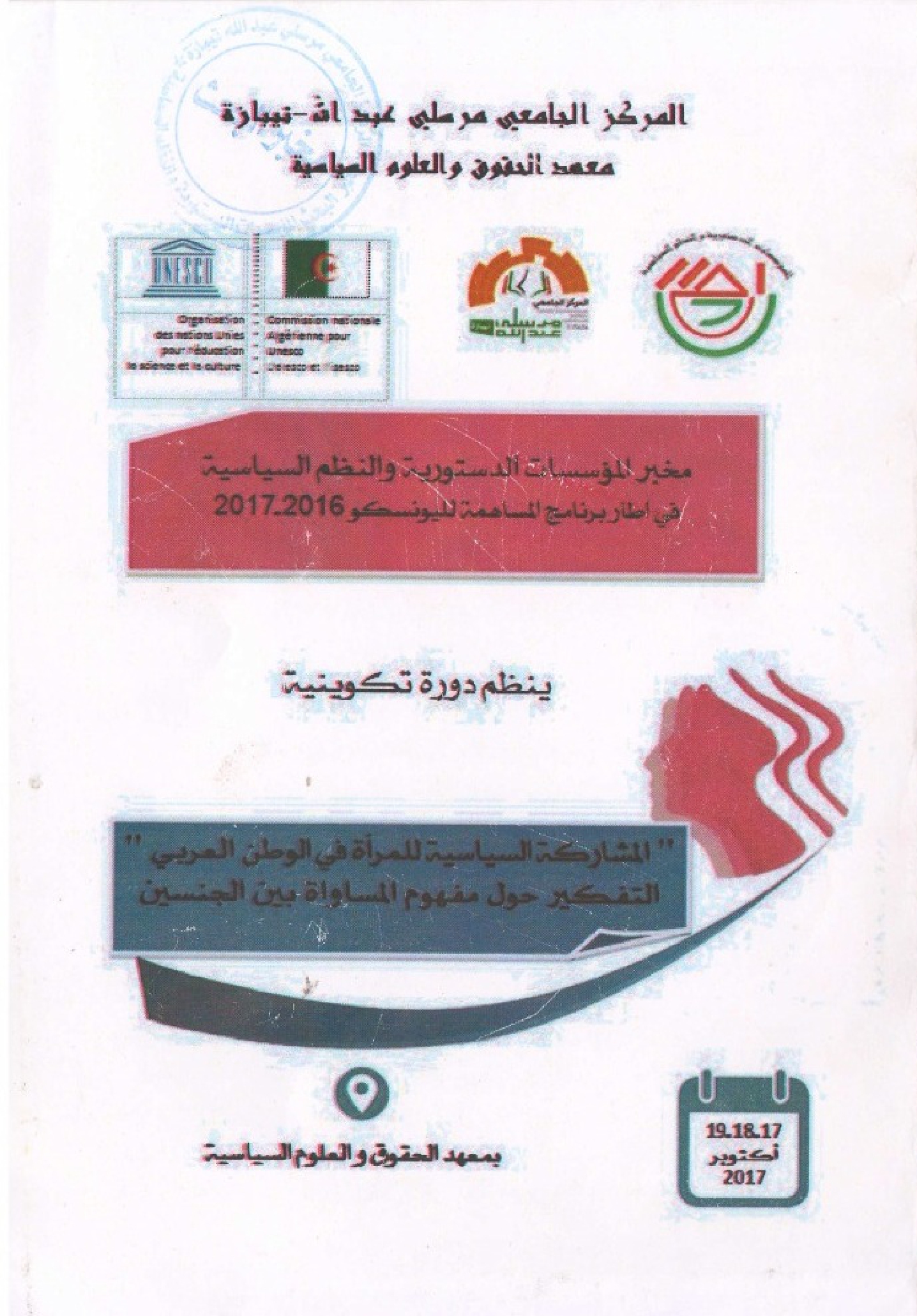 نظم مخبر المؤسسات الدستورية والنظم السياسية دورة تكوينية حول المشاركة السياسية للمرأة في الوطن العربي التفكير حول مفهوم المساواة بين الجنسين بمعهد الحقوق و العلوم السياسية أيام 17-18-19 أكتوبر 2017 بمشاركة اساتذة المعهد .