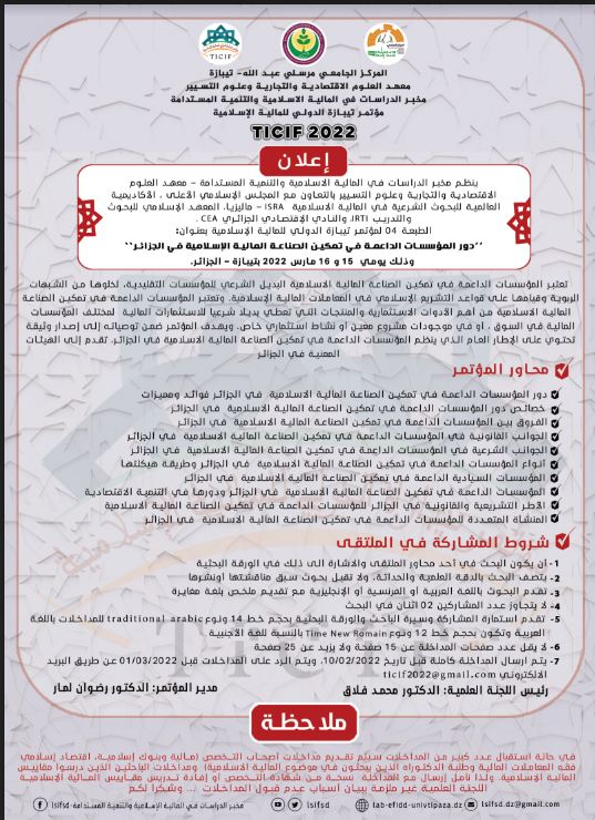الرئيسية/إعلانات/أساتذة/مؤتمر تيبازة الدولي للمالية الإسلامية TICIF الطبعة الرابعة يومي 15-16 مارس 2022 أساتذةإعلاناتاعلاناتتظاهرات علميةملتقيات دوليةيSlider مؤتمر تيبازة الدولي للمالية الإسلامية TICIF الطبعة الرابعة يومي 15-16 مارس 2022 1 يناير 2022 3٬455 أقل من دقيقة 1 يناير 2022 3٬455 أقل من دقيقة اظهر المزيد شاركها فيسبوك تويتر لينكدإن مشاركة عبر البريد طباعة