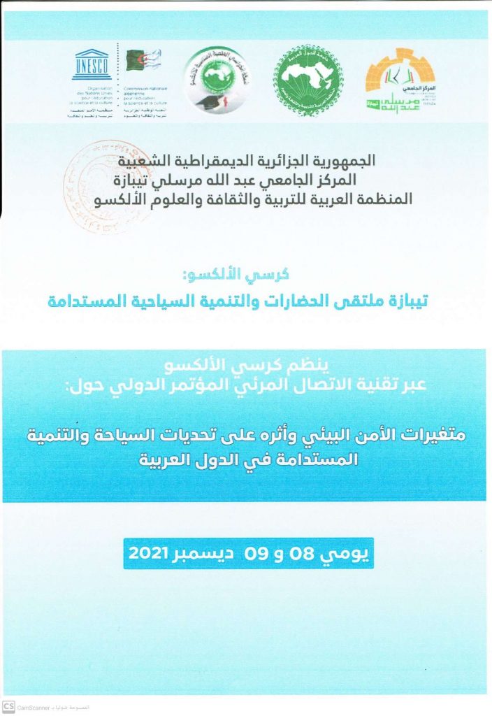 ينظم كرسي الالكسو تيبازة ملتقى الحضارات والتنمية السياحية المستدامة ، عبر تقنية الاتصال المرئي المؤتمر الدولي ، حول متغيرات الأمن البيئي وأثره على تحديات السياحة ،والتنمية المستدامة في الدول العربية، يومي 08 -09 ديسمبر 2021 .