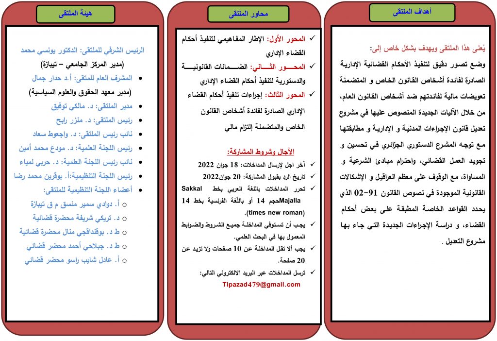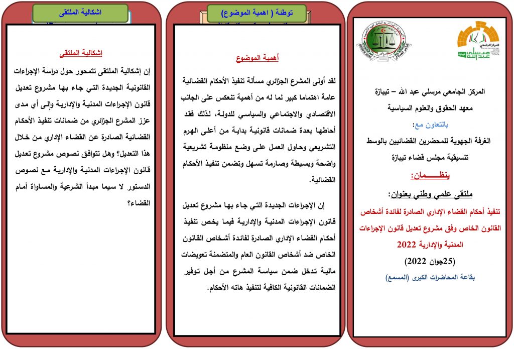 ينظم معهد الحقوق والعوم السياسية بالتنسيق مع الغرفة الجهوية للمحضرين القضائيين وسط تنسيقية مجلس قضاء تيبازة ملتقا علميا وطنيا حول تنفيذ أحكام القضاء الإداري الصادرة لفائدة أشخاص القانون الخاص وفق مشروع تعديل قانون الاجراءات المدنية والادارية 2022 وذلك يوم 25 جوان بقاعة المحاضرات الكبرى ، لمزيد من التفاصيل يمكنكم الاطلاع على المطوية المرفقة