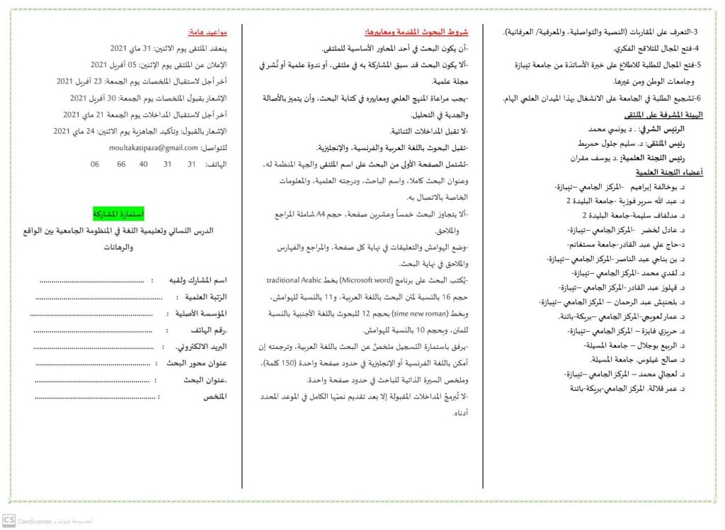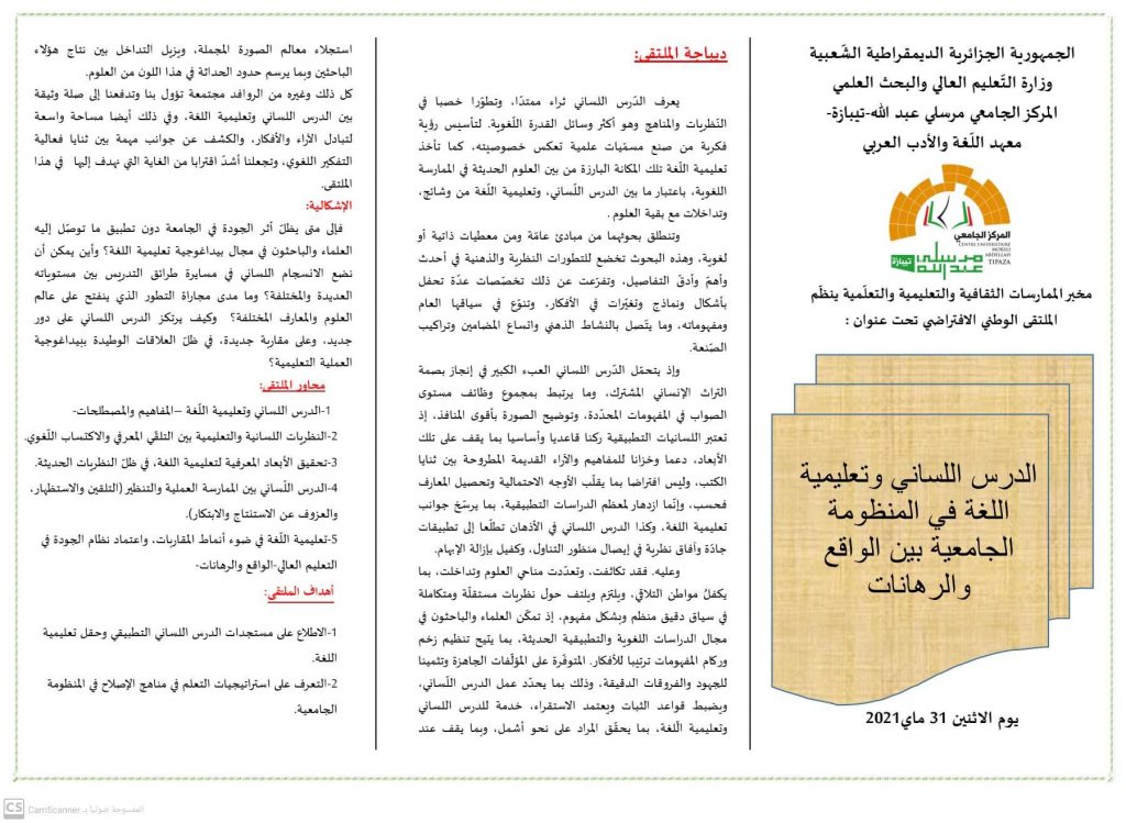 ينظم مخبر الدراسات الثقافية والتعليمية والتعلمية بمعهد اللغات والأدب العربي ملتقا وطني افتراضي يوم الاثنين 31 ماي 2021 للمشاركة يمكنكم الاطلاع على المطوية التالية