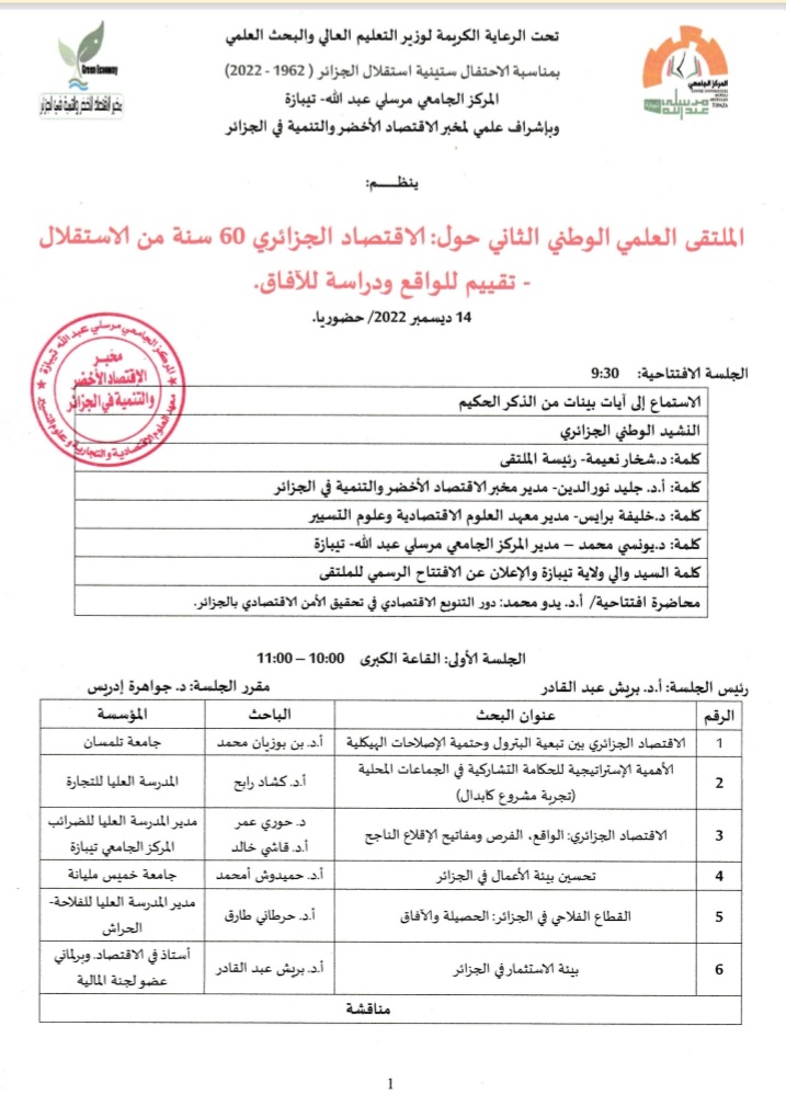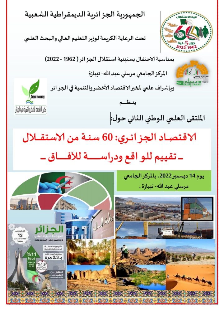 بمناسبة الاحتفال بستينية استقلال الجزائر ( 1962 – 2022) المركز الجامعي مرسلي عبد الله- تيبازة وبإشراف علمي لمخبر الاقتصاد الأخضر والتنمية في الجزائر يسر هيئة تنظيم الملتقى الوطني الثاني أن تدعو جميع الاساتذة والباحثين والطلبة الاعزاء بالمركز الى حضور فعاليات الملتقى الوطني الثاني حول : الاقتصـــاد الجزائـــري: 60 سنـــة من الاستقـــــــلال- تقيـيم للواقع ودراسة للآفاق- يوم 14 ديسمبر 2022، بالمركز الجامعي مرسلي عبد الله- تيبازة، بقاعة المحاضرات الكبرى( مقابل ادارة المركز الجامعي ) يوم : الأربعاء 14 ديسمبر 2022 ، على الساعة : 09:30 صباحا