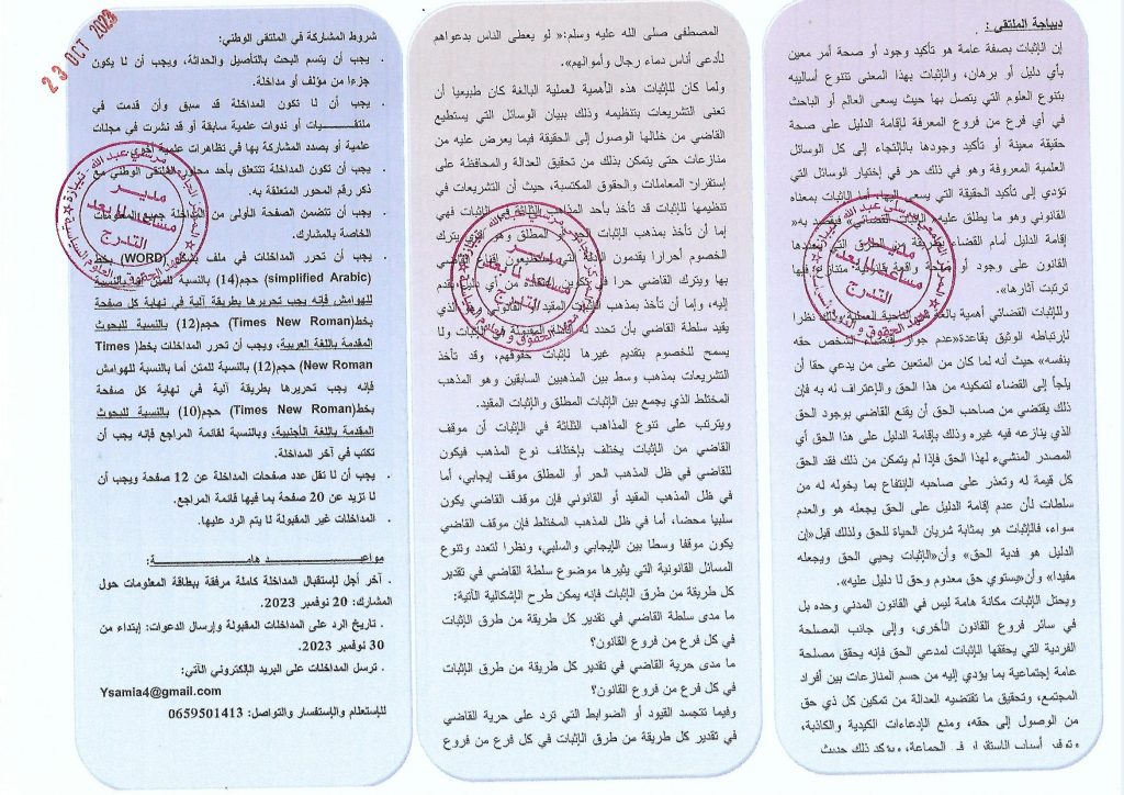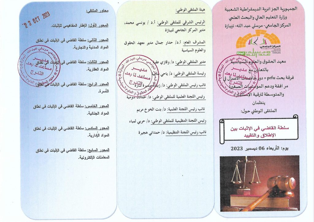 تتشرف الدكتورة ” ياحي سامية” بصفتها رئيسة الملتقى الوطني بدعوة جميع الأساتذة والباحثين للمشاركة في ” الملتقى الوطني” الموسوم ب” سلطة القاضي في الإثبات بين الإطلاق والتقييد” الذي سينظم من طرف معهد الحقوق والعلوم السياسية بالتعاون مع فرقة بحث” دور حاضنات الأعمال في مرافقة ودعم المؤسسات الصغيرة والمتوسطة لترقية الإستثمار” يوم الأربعاء الموافق ل 06 ديسمبر 2023.