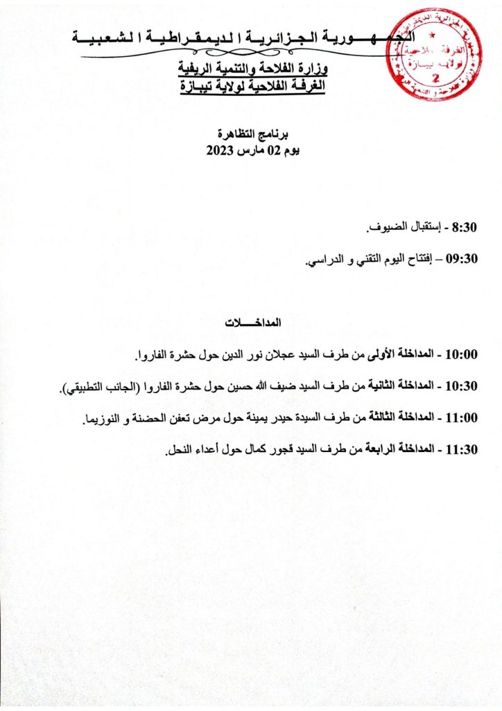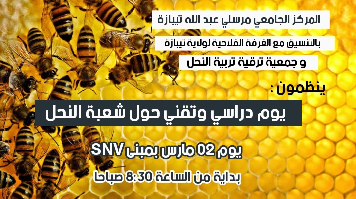 إعلان : ينظم قسم علوم الطبيعة والحياة بمعهد العلوم بالمركز الجامعي تيبازة بالتنسيق مع الغرفة الفلاحية لولاية تيبازة وجمعية ترقية تربية النحل يوما درسيا وتقنيا حول شعبة النحل، وذلك يوم 02 مارس بمبنى SNV بداية من الساعة 8:30 صباحا . الدعوة عامة