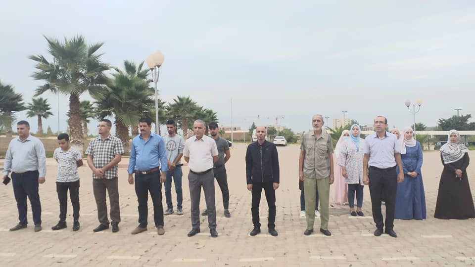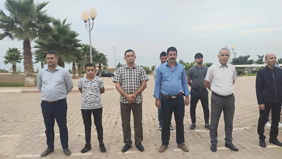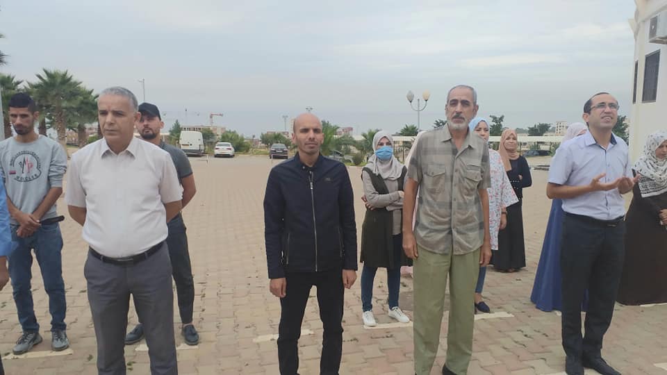 الدكتور محمد يونسي مدير المركز الجامعي مرسلي عبد الله تيبازة.رفقة الأستاذ دواوي نائب المدير المكلف بالبحث العلمي ،اضافة الى السيد الطيب مقراني الأمين العام للمركز وكذا رؤساء المصالح وموظفي المركز، يقفون دقيقة صمت و يقرأون فاتحة الكتاب على ارواح شهداء مجازر 17 أكتوبر .